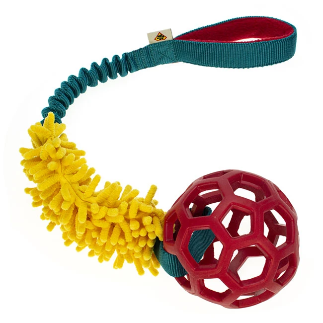 Das ultimative Bestätigungsspielzeug, bestehend aus einem JW Hollee Ball in Gr. M und einem Mopp, die an einem Bungee-Seil befestigt sind.