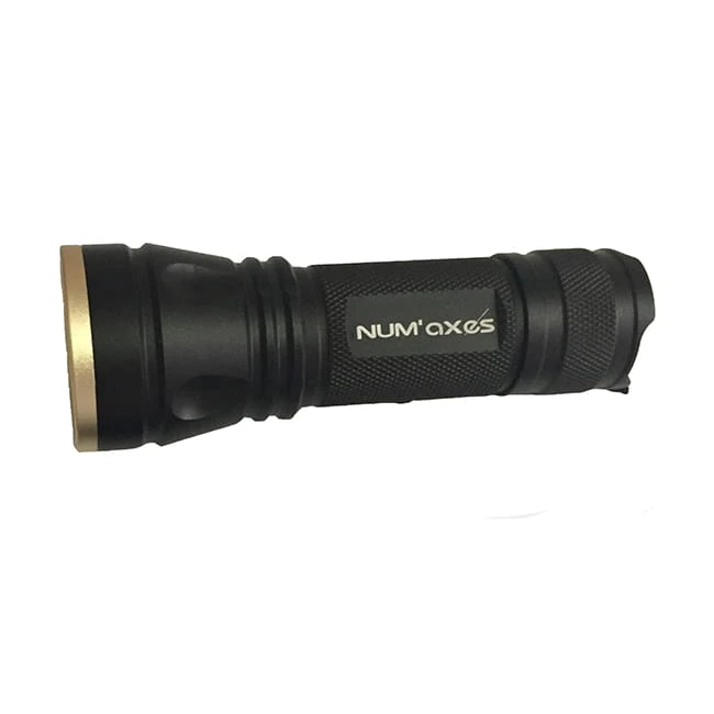 Robuste Taschenlampe mit Gehäuse aus eloxierter Aluminiumlegierung von Num‘axes, die auch hut mit schlechtem Wetter zurecht kommt.