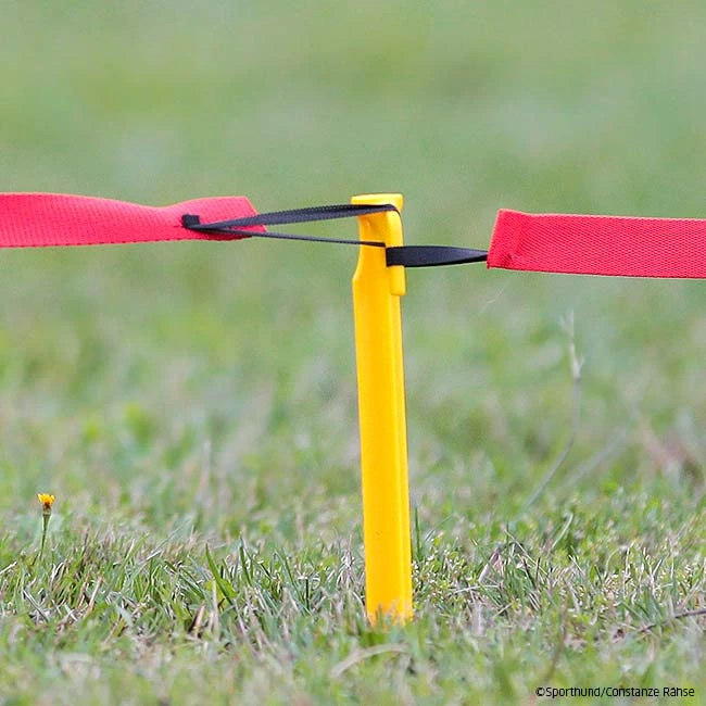 Das Set besteht aus gelben Kunststoffheringen (30,5 cm) lang, die gutsichtbar und nicht zu spitz sind, um den Hund nicht zu verletzen und mehreren Nylongurten, in die ein elastisches Band eingearbeitet ist. Die angenähten Laschen lassen sich leicht in die die Heringe einhängen. In das Band sind zwei reflektierende Streifen eingearbeitet.