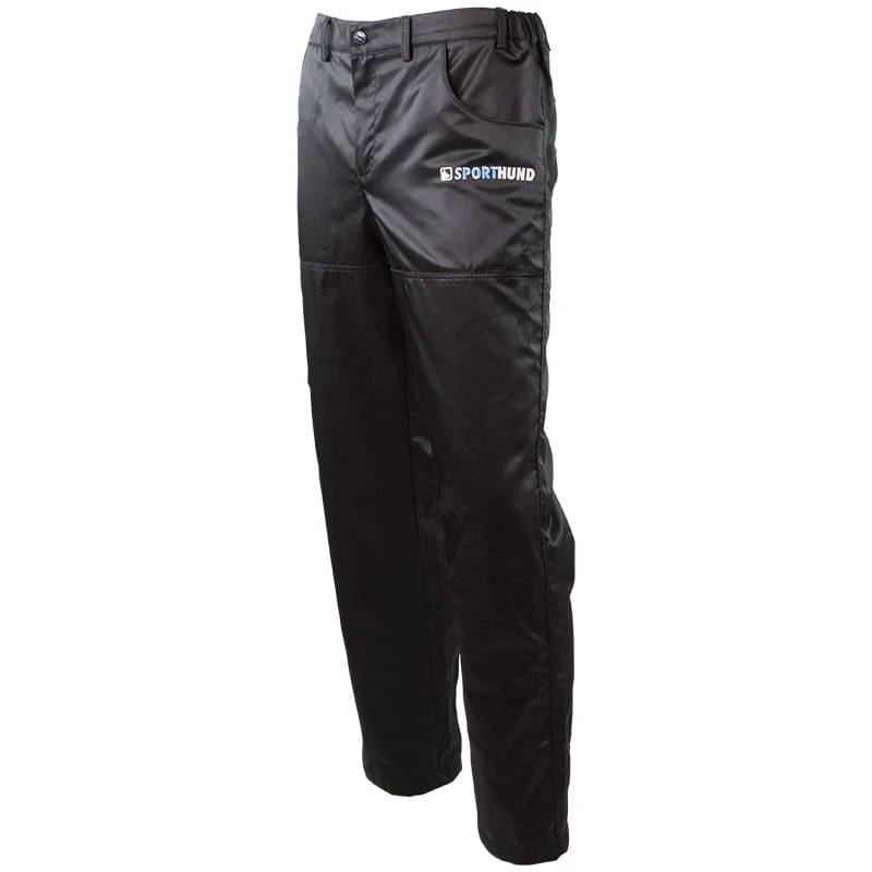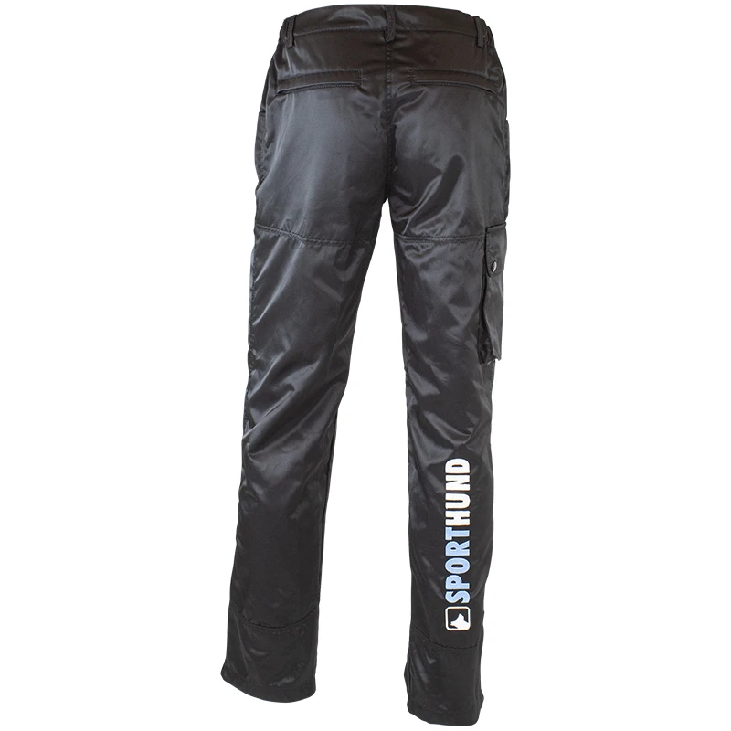 Die Hose ist komplett schwarz, mit SPORTHUND Stick vorne klein unter der Tasche und auf dem rechten Hosenbein hinten in groß.