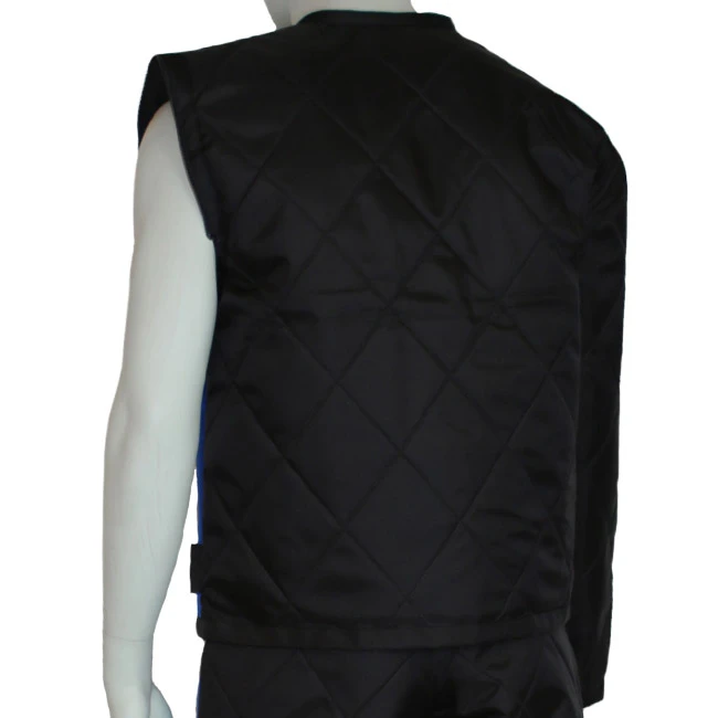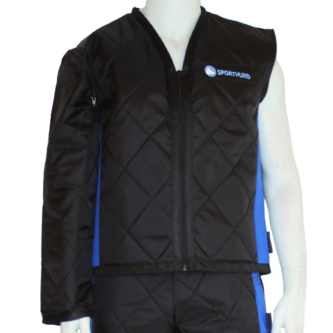 Die Jacke ist seitlich mit einem blauen Streifen abgesetzt.