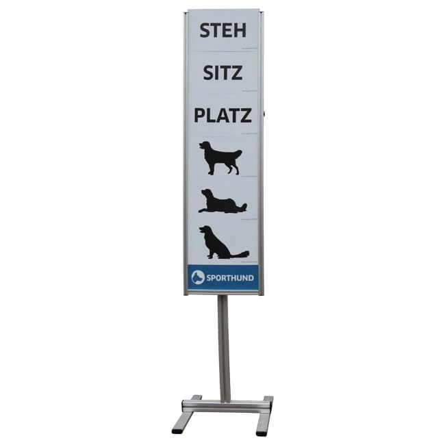 was bei Wind extra Standfestigkeit garantiert. In den oberen Rahmen können die einzelnen Symboltafeln beliebig eingeschoben und schnell gewechselt werden. Mit zwei Sterngriffschrauben ist die Höhe einfach beliebig verstellbar. Im Lieferumfang sind sechs Symboltafeln entahlten, je zweimal die Positionen „Sitz“, „Platz“ und „Steh“, alle beidseitig mit Bild- oder Schrift bedruckt. Die Tafeln sind aus Alu-Dibond, damit ist das gesamte Gerät wetterfest und aufgrund des geringen Gewichtes leicht transportierbar.