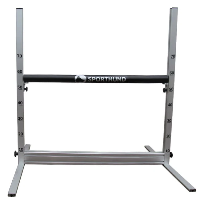 Sehr einfacher, schneller Zusammenbau (Imbus 6). Für mobile Verwendung braucht es kein Werkzeug, es müssen nur zwei Sterngriffschrauben gelöst werden. Die geforderte Rasterung der Sprunghöhe von 10 – 70 cm kann durch leichtes Lösen zweier Sterngriffschrauben einfach und bequem verstellt werden. Beidseitig sind Markierungen für die Höheneinstellung angebracht. Die leichte Querstange aus Kunststoff hat einen Durchmesser von 5 cm. Keine Verletzungsgefahr für den Hund an Ecken und Kanten. Bauweise gemäß der aktuellen FCI PO.