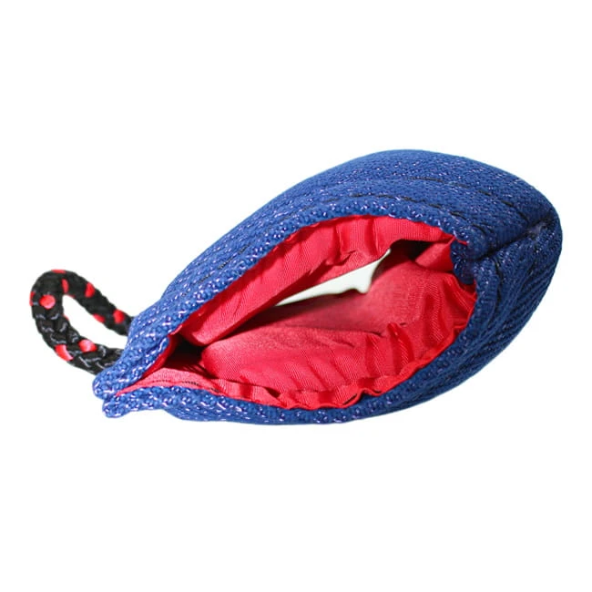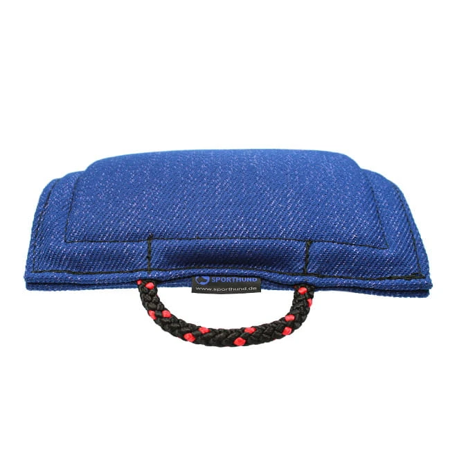 Das Sporthund Welpen Hohlbeißkissen ist kompakt und dennoch so groß, dass der Hundesport-Nachwuchs bereits im jungen Alter einen ordentlichen Griff setzen kann. Das Nylcot-Kissen mit weicher Schaumstoff-Füllung ist aus einem Stück gefertigt und „umgefaltet“. So entsteht ein Bereich, in dem der Hundeführer auch mal eine Hand stecken und präsentieren kann. Am stabil ausgeformten Textilgriff lässt sich super „zergeln“ oder auch mal eine Leine anbinden.