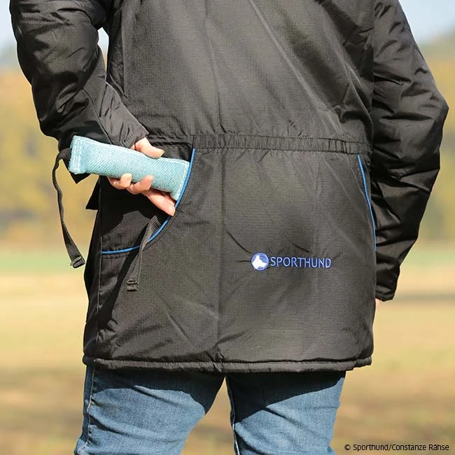 Die neue Sporthund Winterjacke in schwarz mit blauen Ziernähten kombiniert, die Wärme einer Jacke mit der Praktikabilität einer Hundeführerweste.